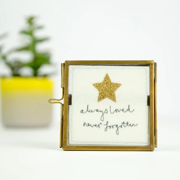 The silver finish has a silver coloured frame, along with a silver sparkly star. The brass and gold finish has a brass frame, along with a gold sparkly star. Both of these have the words “Always loved, never forgotten” embroidered underneath the star.