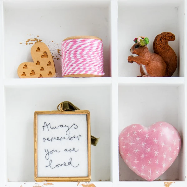 I think we all have times when we need to be reminded that we are loved and these tiny embroideries are the perfect thing for showing those we love that we love them. Perfect for Mother's Day, Valentines or just because. They're each embroidered by freehand in a grey thread into a piece of off white wool fabric before being added to a small frame with an olive green hanging cord.