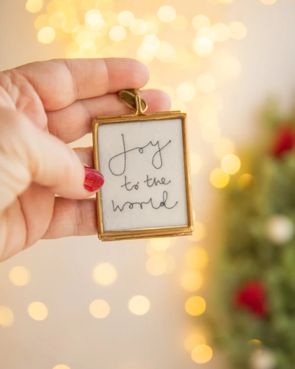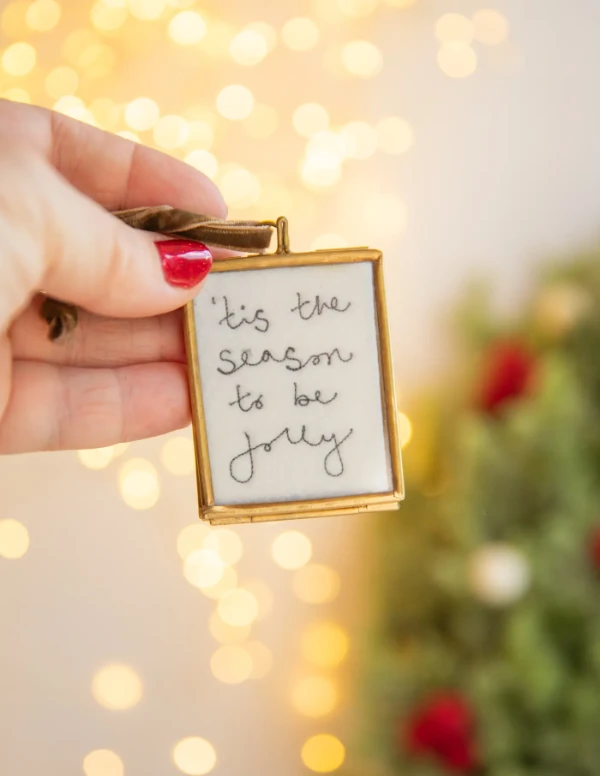 Uniquely made by hand and hanging delicately from gold velvet ribbon and exquisitely crafted, these celebrate well known Christmas sayings through free-motion machine embroidery detailing.