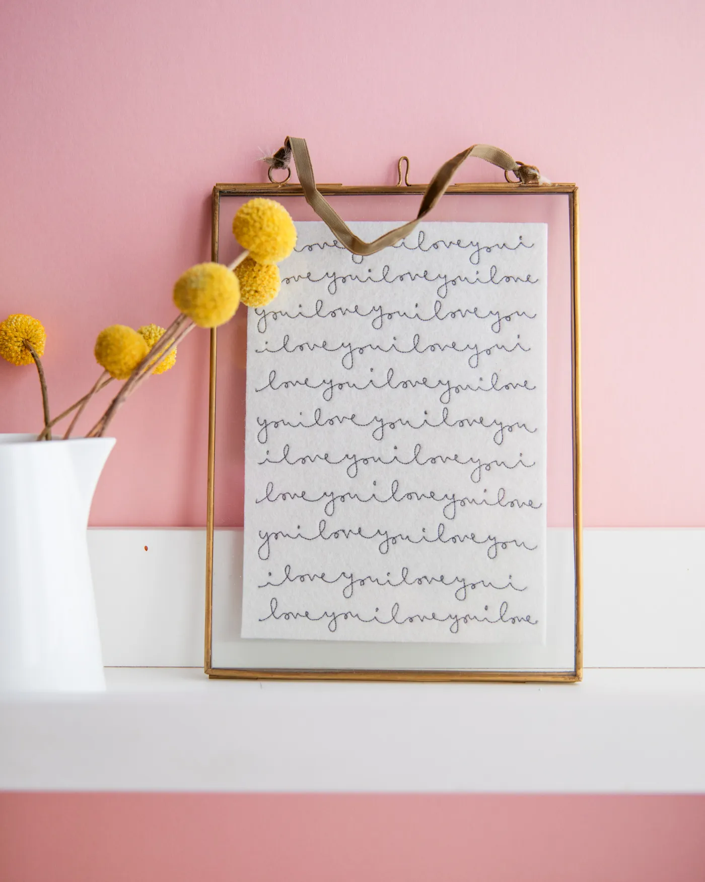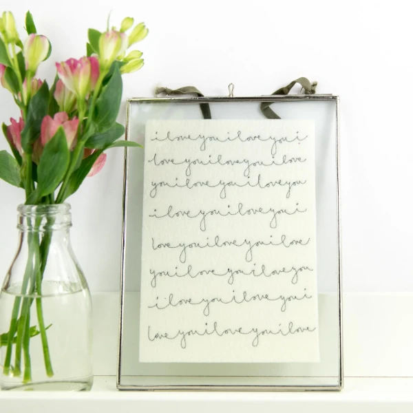 Express your emotions, and declare your true feelings in style with this romantic embroidery frame. This is one of my larger pieces, and features a repeat of the phrase “I love you” in my trademark embroidery style.