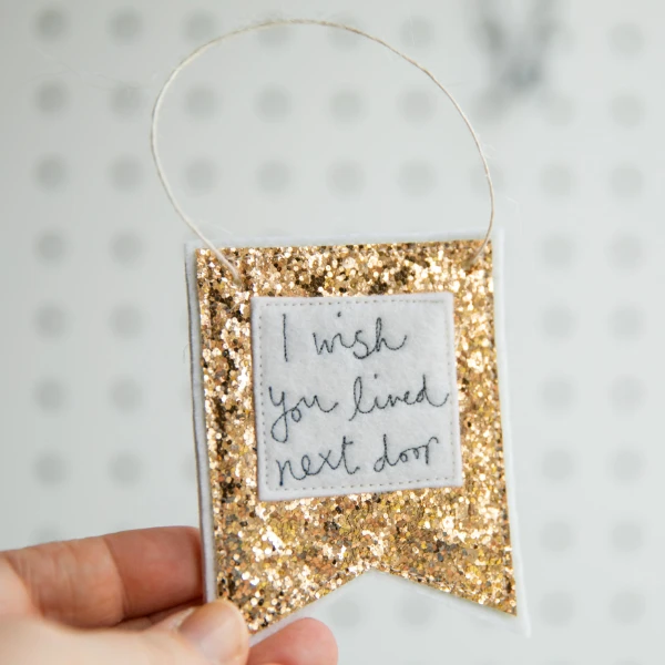 Made from sparkly pale gold fabric, this lovely banner is embroidered with the personal message ‘I wish you lived next door’. After a season where we have all had to keep our distance from loved ones, this handmade decorative banner would make a lovely gift for someone you miss seeing and want to reach out to. There are some special people in my life who I really do wish lived next door, and that’s what inspired me to make this banner.