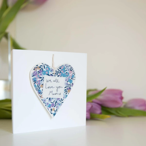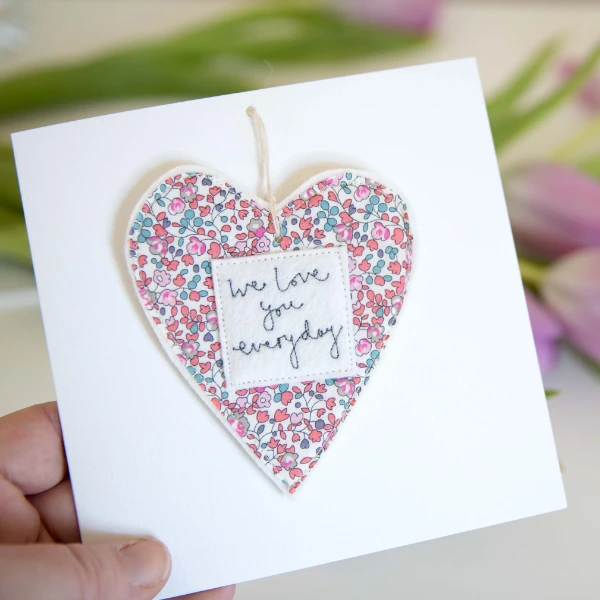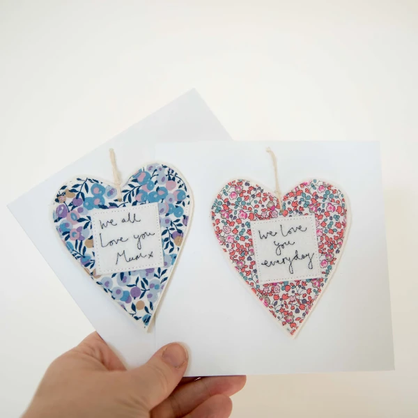Each keepsake is handcrafted in my Staffordshire studio - it’s a completely manual process, and as a result, each “hug” is unique. I stitch your message onto 100% wool fabric using free motion embroidery techniques and my handwriting, and then stitch it onto a fabric heart made out of a linen mix front and a wool back. The heart is finished with a delicate hanging cord before being affixed to a white greetings card.