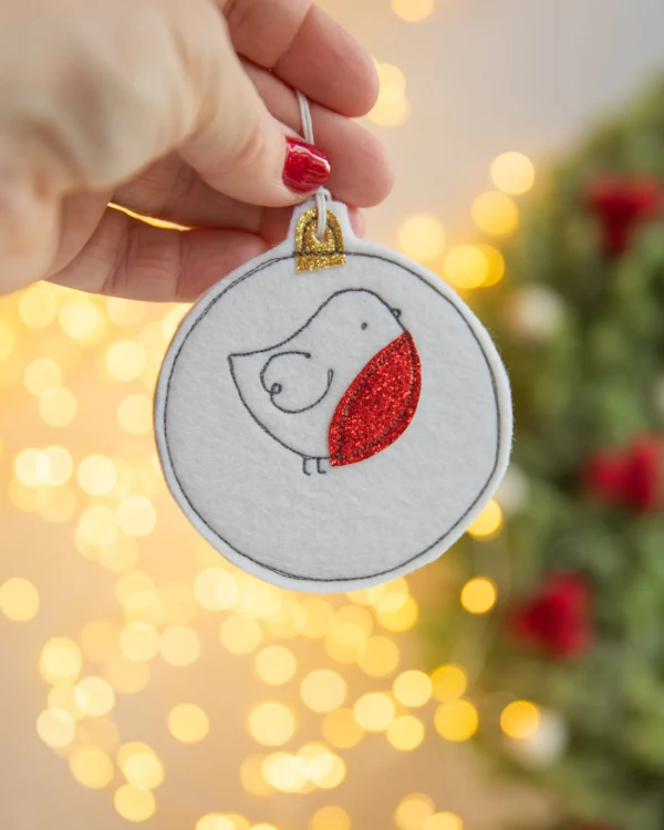 Hand-made using free-motion machine embroidery techniques with the addition of sparkly contrasting fabric details, this joyful Christmas bauble is designed as a special and distinctive addition to a tree, present, card or personalised table setting and can be reused each year.