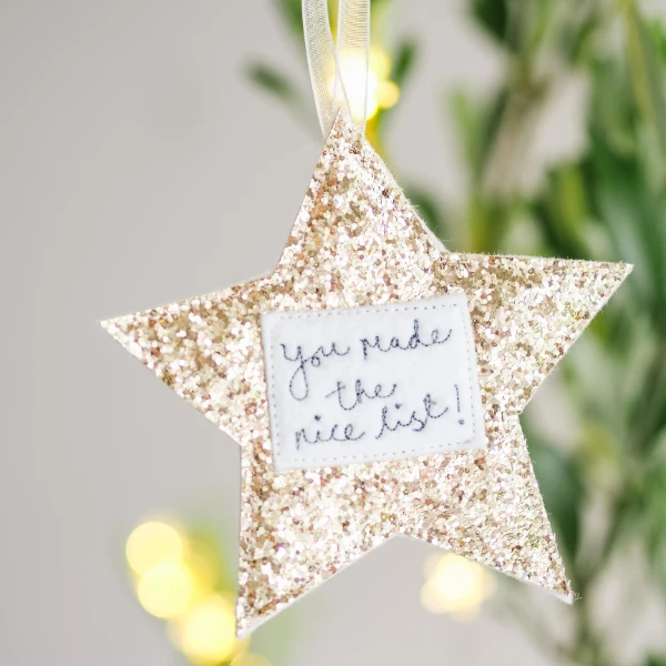 The words 'you've made the nice list' are stitch before being added to your choice of colour glittery star.