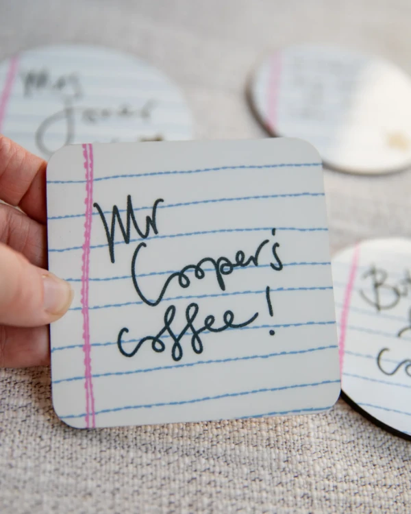 You can personalised them with up to 10 words which I will draw out and print onto your choice of coaster, you can select round, square or heart shaped.