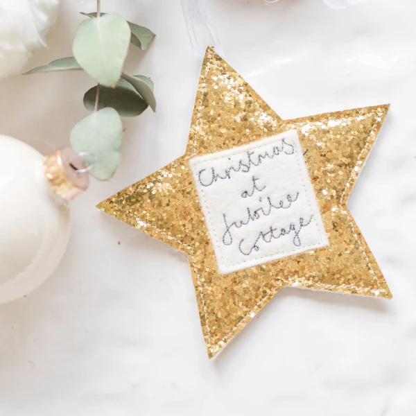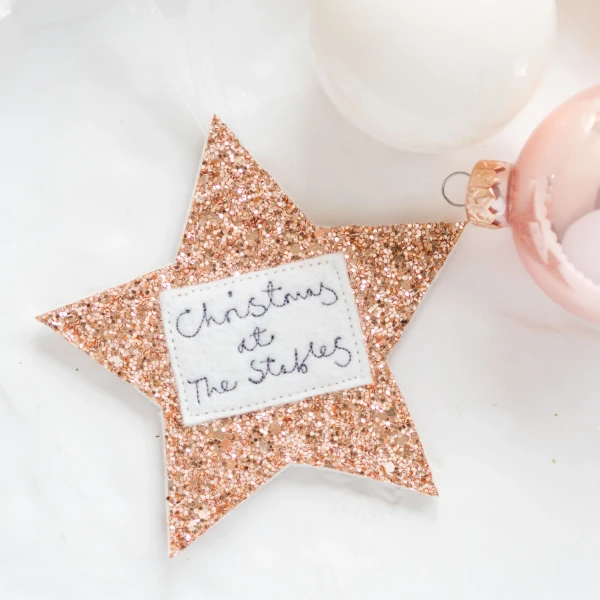 A wonderful way to mark a special time of year, these lovely handmade glittery hanging star Christmas tree decorations are available in 5 different sparkly colours (red, silver, gold, pale gold or rose gold, please select from the drop-down box below), come in two sizes, and are personalised with a stitched message with either your family name or name of your home.