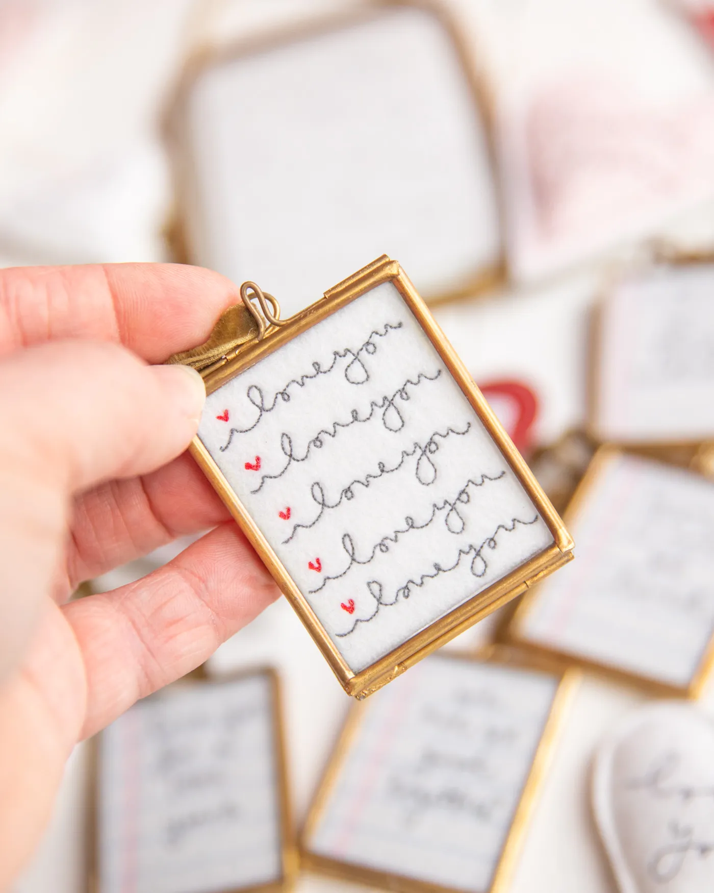 This is the smallest of my i love you frames, the words are stitched by free hand embroidery three times before i stitch tiny red hearts above each i. They come in a small brass frame with an olive green hanging ribbon a great size to pop on your dressing table or on a shelf.